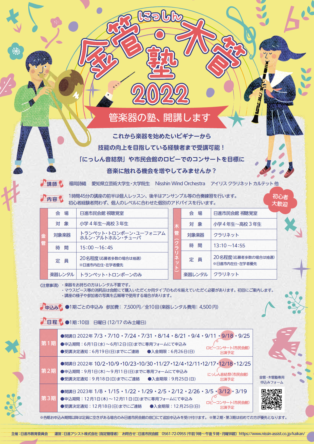 | 申込み | 【第3期】 12月1日(木)~12月11日(日)までに「にっしん金管・木管塾2022」専用申込みフォームよりお申込みください。 受講決定通知:12月18日(日)までに受講の可否を申込み時に提出いただくメールアドレスへご連絡します。 入金期限:12月25日(日) 窓口先着受付:12月20日(火)から 金管塾(ホルン・アルトホルン・テューバ・ユーフォニアム・木管塾(クラリネット)の受付を行います。※若干名 |
